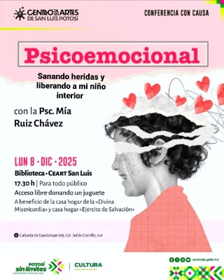 El Centro de las Artes (Ceart) invita a participar en la Conferencia con causa "Psicoemocional", impartida por Mía Ruiz Chávez, este lunes 8 de dici...