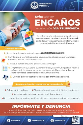 La Fiscalía General del Estado de San Luis Potosí (FGESLP) hace un llamado a la ciudadanía para que mantenga previsiones y evite caer en estafas te...