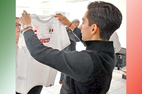 Donovan Carrillo, con una de las playeras que usará la delegación mexicana en los Juegos de Invierno.