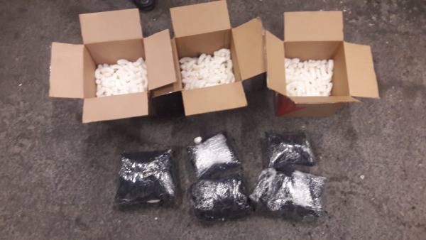 A las 04:20 h., se localizaron 3 cajas de cartón con destino a Zacatecas, Colima y Chihuahua, que ocultaban el mismo enervante en su interior, sumando un total de 1 kilo 800 gramos.