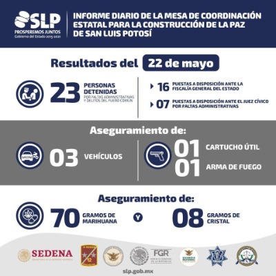 Como resultado del trabajo colaborativo, que de manera cotidiana implementan los tres niveles de gobierno en la Mesa de Coordinación Estatal para la Construcción de la Paz, en el transcurso del día 21 de mayo, se aprehendió a un total de 23 personas por ser presuntos responsables de cometer diversos ilícitos.