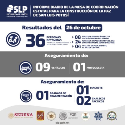 La Mesa de Coordinación Estatal para la Construcción de la Paz, informó que durante el fin de semana correspondiente al 23, 24 y 25 de octubre, 9 vehículos fueron recuperados en operativos de seguridad en las cuatro regiones de San Luis Potosí, además, 36 personas fueron detenidas por delitos del fuero común y por faltas administrativas, de los que 8 fueron puestas a disposición de la Fiscalía General del Estado, 24 ante el juez cívico y 4 ante el juez de control.
