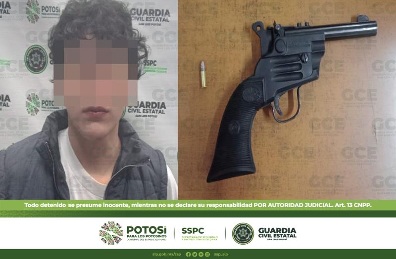 Al continuar con los operativos de seguridad, en el municipio de Soledad de Graciano Sánchez, elementos de la Guardia Civil Estatal detuvieron a José de 18 años de edad en la colonia Hogares Obreros, tras asegurarle un arma de fuego tipo revólver, calibre .22 con un cartucho útil.