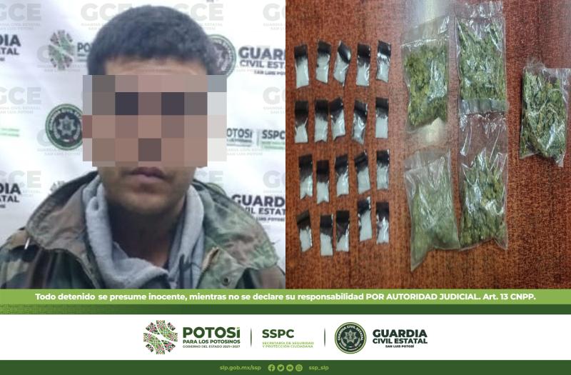 Los hechos ocurrieron durante los dispositivos de vigilancia en la colonia San Luis, a la altura de la avenida Universidad, donde las autoridades tuvieron contacto con José de 28 años de edad, quien, al ver la presencia de las fuerzas del orden, trató de evadir a los uniformados, sin embargo se le dio alcance y se le aseguraron cinco bolsas con marihuana y 20 dosis de "cristal", preparadas para su venta individual.