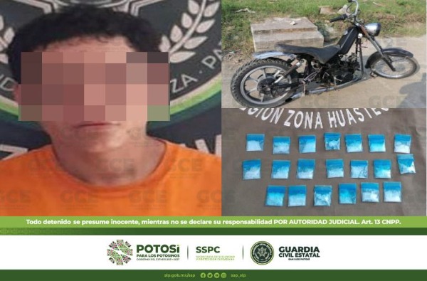 Durante los operativos preventivos y disuasivos, emitidos en la zona Huasteca por oficiales de la Guardia Civil Estatal (GCE), un supuesto narcomenudista fue identificado por las autoridades; se le aseguraron 20 dosis de la droga sintética conocida como "cristal".