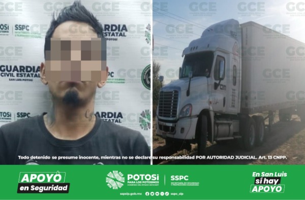 Elementos de la Guardia Civil Estatal recuperaron un tractocamión con reporte de robo luego de trabajos de seguridad y prevención efectuados en la carretera a Matehuala.