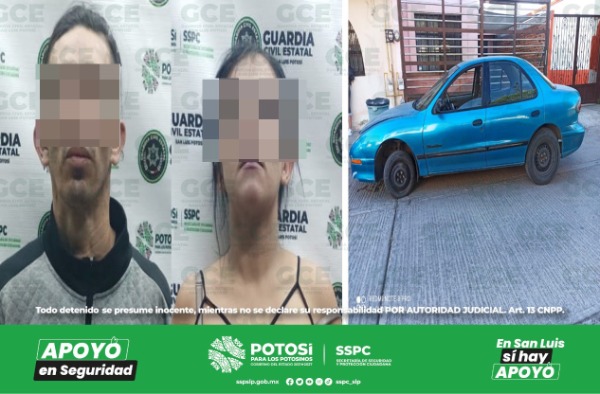 Como resultado de la reacción inmediata a situaciones que ponen en riesgo la integridad y patrimonio de la ciudadanía potosina, derivado del despliegue del Plan Operativo Otoño-Invierno Seguro 2023, agentes de la Guardia Civil Estatal (GCE) detuvieron a una pareja de presuntos ladrones de vehículos a bordo de un automotor hurtado en días anteriores.