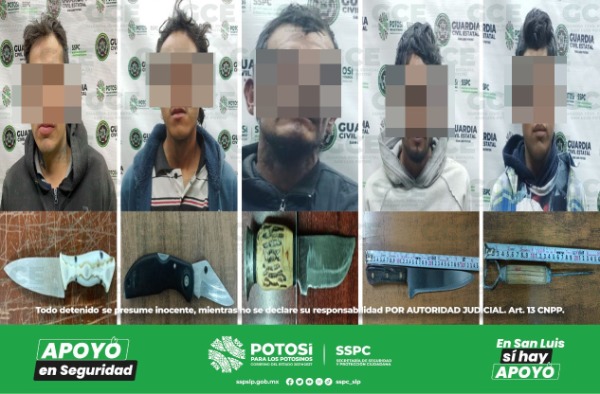 Tras los patrullajes preventivos, efectuados en colonias de la capital potosina, elementos de la Guardia Civil Estatal (GCE), arrestaron a cinco individuos, por probable portación de cuchillos y navajas.