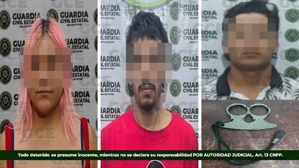 En la capital potosina, autoridades estatales arribaron a la colonia Las Piedras, ahí detuvieron a Sonia "N" de 27 años de edad, luego de que su suegro solicitara del apoyo legal para proceder en su contra, por el probable delito de violencia familiar; Marco "N" de 25 años, fue detenido en la colonia El Palmar, tras la denuncia de su pareja sentimental, quien indicó ser víctima de violencia; por último, en el municipio de Villa de Pozos, un adolescente de 17 años fue detenido, luego de que su progenitora solicitara del auxilio de los uniformados; al momento de su arresto se le aseguró una manopla de metal conocida como "bóxer".