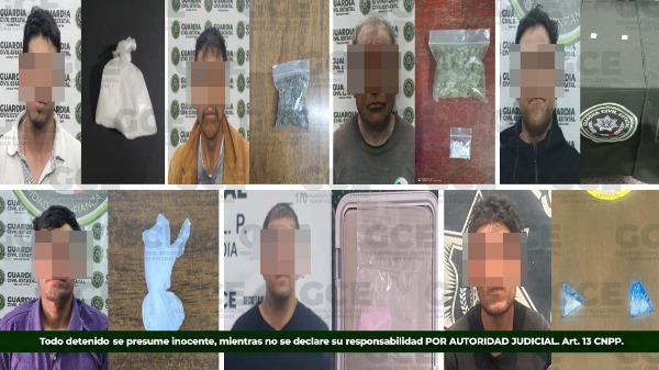 En la colonia Tercera Grande, Jesús "N" de 33 años de edad, fue detenido tras asegurarle una dosis de "cristal"; Iván "N" de 18 años, fue ubicado en la colonia Satélite, con un envoltorio con marihuana; sobre la colonia Los Reyes, Oscar "N" de 30 años, fue ubicado con una bolsa que tenía marihuana; José "N" de 25 años, quedó detenido en la colonia Julián Carrillo, con dos dosis de cocaína.