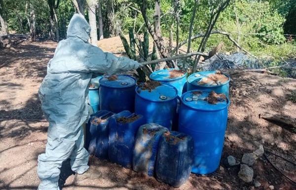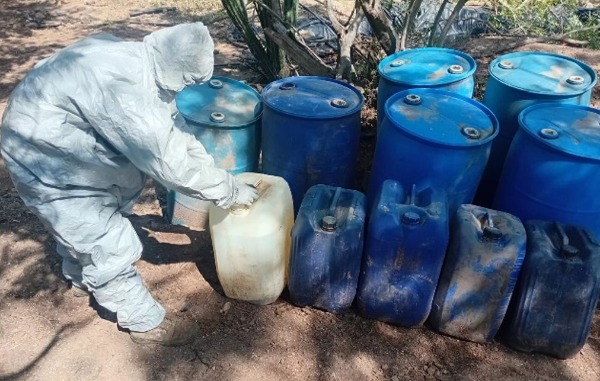 En Cosalá, se localizó e inhabilitó un área de concentración de material diverso para la fabricación de drogas sintéticas, se aseguraron 1,000 litros de sustancias para la elaboración de metanfetamina. La afectación económica a la delincuencia organizada es de 20 millones de pesos.
