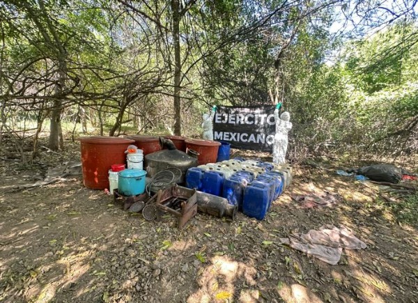 En Tamazula, Durango, en el poblado El Aguaje, elementos del Ejército Mexicano localizaron e inhabilitaron un área de concentración de material diverso para la elaboración de metanfetamina, asegurando 2,250 litros de sustancias químicas, un reactor de síntesis orgánica, un destilador y dos quemadores.