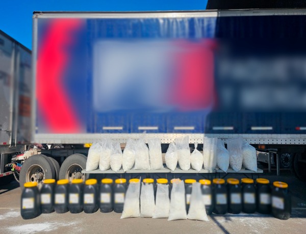 -En San Luis Río Colorado, elementos del Ejército Mexicano y GN, al inspeccionar un tractocamión de una empresa de paquetería y mensajería, procedente de Hermosillo con destino a Mexicali, Baja California, detuvieron a dos personas y aseguraron 340 kilos de metanfetamina en 19 bidones de plástico.