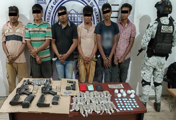 -En Pinotepa Nacional, elementos de GN detuvieron a seis personas, aseguraron dos armas largas, un arma corta, cargadores, 73 cartuchos, diversas dosis de droga, dos chalecos tácticos y 4 motocicletas.