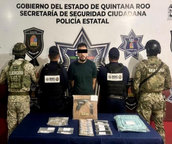 -En Benito Juárez, elementos de SSPC, Semar y Ejército Mexicano detuvieron a una persona, le aseguraron 106 dosis de diferentes drogas, un arma corta, 12 cartuchos, un vehículo, una mochila y cuatro teléfonos celulares.
