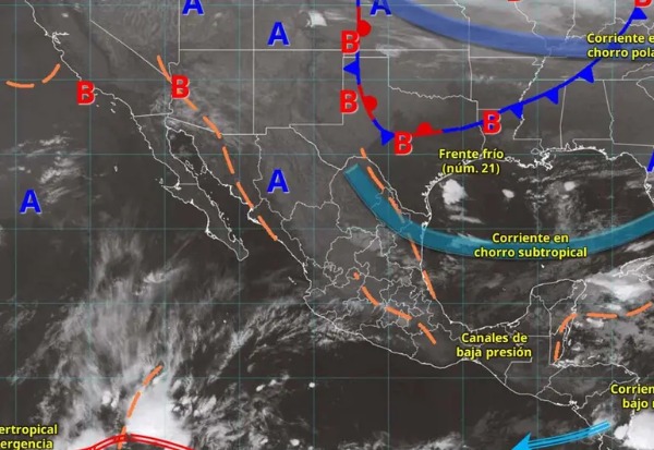 Por su parte, el nuevo frente frío (número 21) se extenderá en el transcurso del día sobre el norte y noreste de la República Mexicana, en interacción con la corriente en chorro subtropical ocasionará rachas de viento de 40 a 60 km/h en las citadas regiones; así como lluvias y chubascos en zonas de Nuevo León, Tamaulipas y San Luis Potosí.