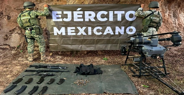 En Badiraguato, se aseguraron tres armas largas, nueve cargadores, 285 cartuchos, un aditamento lanzagranadas, 40 artefactos explosivos improvisados, un dron, un chaleco táctico y un vehículo.