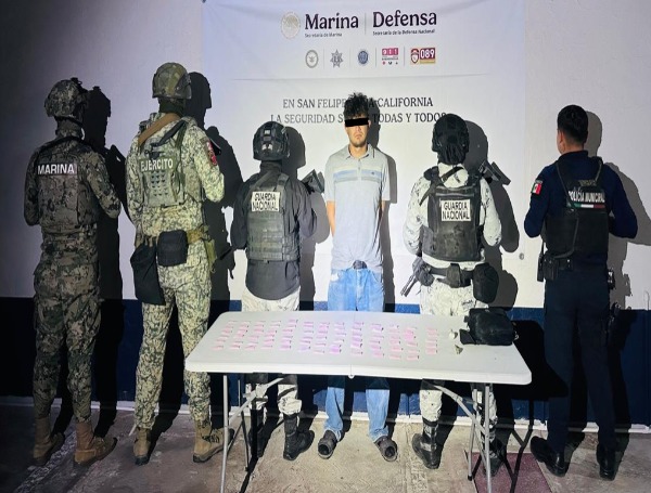 En Tecate y San Felipe, se detuvo a tres personas, se aseguraron tres armas cortas, cinco cargadores, 48 cartuchos, 75 dosis de metanfetamina y un vehículo.
