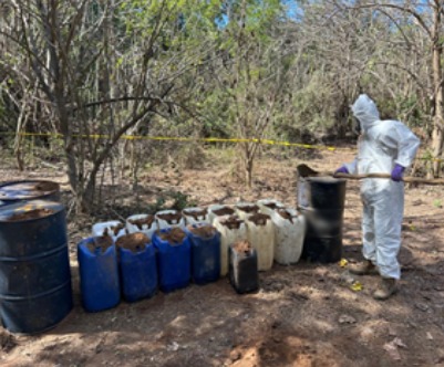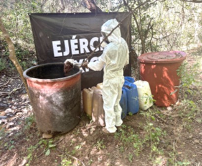 En Cosalá, se localizaron e inhabilitaron cuatro áreas de concentración de material diverso para la fabricación de drogas sintéticas, se aseguraron 3,489 litros de sustancias químicas para la elaboración de metanfetamina. La afectación económica a la delincuencia organizada es de 69 millones de pesos.