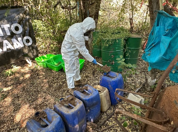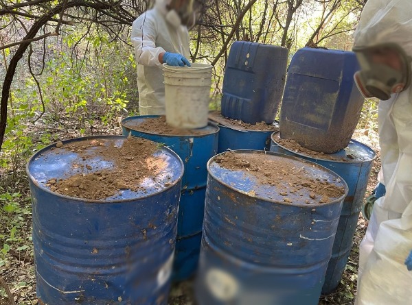 En otra acción en el mismo municipio, se localizaron e inhabilitaron tres áreas de concentración de material diverso para la fabricación de drogas sintéticas, se aseguraron 2,905 litros de sustancias para la elaboración de metanfetamina. La afectación económica a la delincuencia organizada es de 57 millones de pesos.