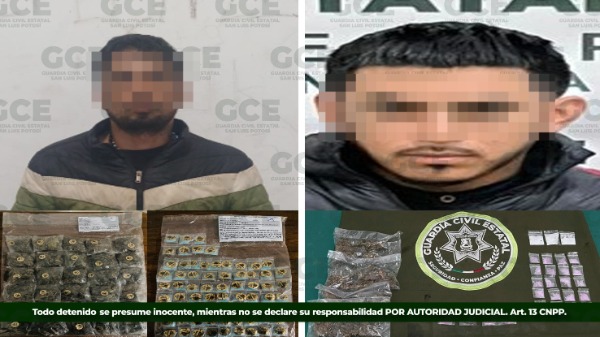 Derivado de trabajos de inteligencia, se realizaron acciones operativas en los municipios de Rioverde y Rayón, que permitieron la detención de dos presuntos vendedores de narcóticos y el desmantelamiento de probables "puntos" de venta de droga vinculados a un grupo delictivo.