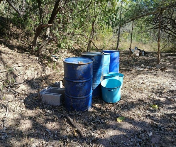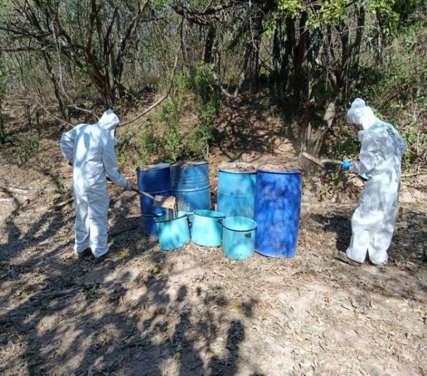 En Culiacán, Sinaloa, en el poblado Corral Viejo, elementos del Ejército Mexicano localizaron e inhabilitaron un área de concentración de material diverso para la elaboración de metanfetamina, asegurando 2,220 litros de sustancias químicas.