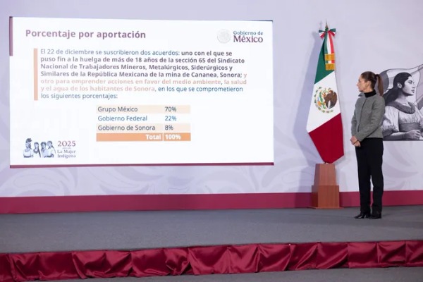 La secretaria de Gobernación, Rosa Icela Rodríguez, detalló que el pasado 22 de diciembre se suscribieron dos acuerdos: 1. Fin de la huelga de más de 18 años de la Sección 65 del Sindicato Nacional de Trabajadores Mineros, Metalúrgicos, Siderúrgicos y Similares de la República Mexicana de la mina de Cananea, Sonora, y 2. Para emprender acciones en favor del medio ambiente, la salud y el agua de los habitantes de Sonora, en los que se comprometieron 2 mil 222.6 millones de pesos (mdp) como parte de una inversión conjunta entre Grupo México, el Gobierno Federal, el Gobierno de Sonora y el Depósito de Grupo México ante la Junta Federal de Conciliación y Arbitraje (JFCA) 2018 y 2019 para la implementación del Plan de Justicia.