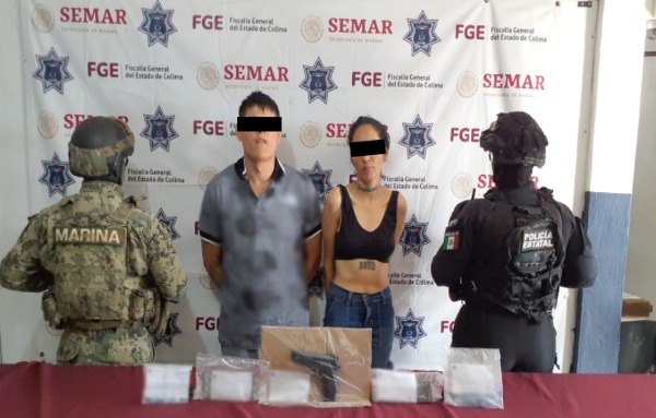 -En Colima, en la colonia Santa Elena, elementos de la Secretaría de Marina (Semar) y Policía Municipal, al realizar recorridos de seguridad, detuvieron a dos personas, les aseguraron 30 dosis de metanfetaminas, una réplica de arma corta y dos celulares.