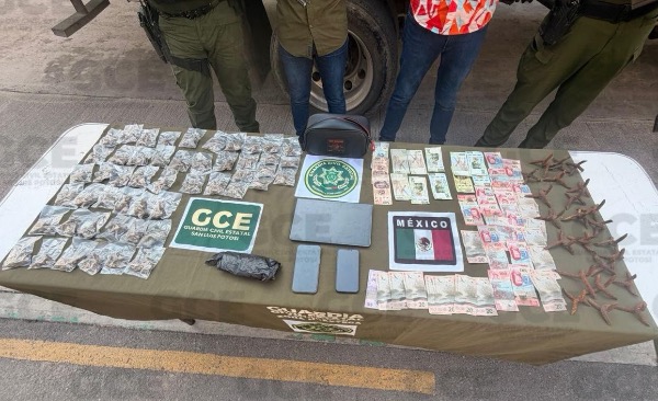 Agentes de la Guardia Civil Estatal, lograron desarticular a presuntos integrantes de una banda dedicada al cobro de piso y extorsiones a comerciantes en la región Huasteca a quienes se les aseguró droga y artefactos metálicos conocidos como "poncha llantas".