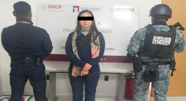 -En Tijuana, en el Puente Internacional Mesa Otay de la Aduana, elementos de la Guardia Nacional (GN), al realizar un reconocimiento aduanero a un vehículo, procedente de Los Ángeles, detuvieron a una mujer de nacionalidad estadounidense, aseguraron 18 cheques por 74,574 dólares americanos y un vehículo.
