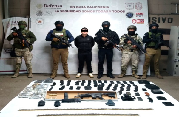 -En Mexicali, elementos del Ejército Mexicano, Fiscalía y Policía Estatal detuvieron a una persona a bordo de un vehículo, aseguraron un arma larga, 43 cargadores, 2,410 cartuchos, un aditamento lanzagranadas, dos cintas eslabonadas y cinco placas balísticas.