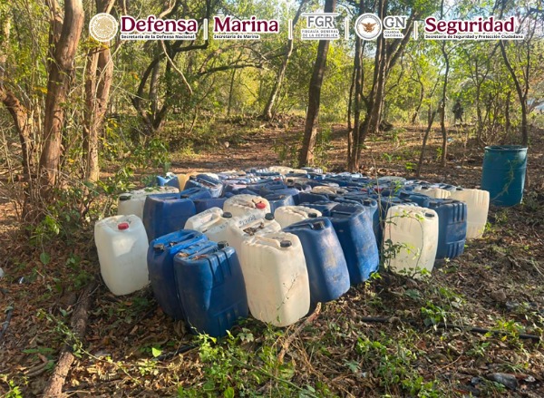 En otra acción, en Cosalá, Sinaloa, al realizar funciones de reconocimiento, se localizaron e inhabilitaron 11 áreas de concentración de material diverso para la elaboración de drogas sintéticas, se aseguraron 16,486 litros y 75 kilos de sustancias químicas.
