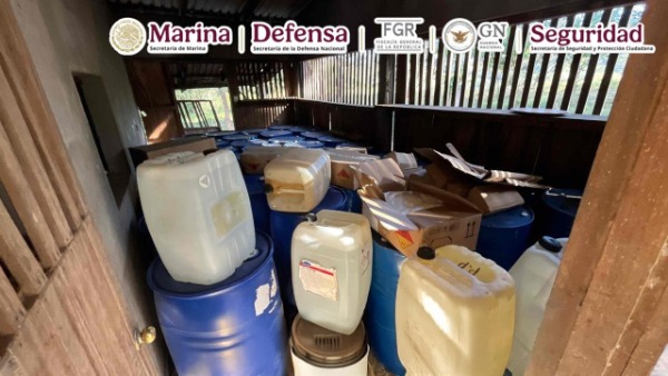 En el marco de las acciones permanentes para el mantenimiento del Estado de derecho, elementos de la Secretaría de Marina (Semar), a través de la Armada de México, en coordinación con la Secretaría de Seguridad y Protección Ciudadana (SSPC), Fiscalía General de la República (FGR), Secretaría de la Defensa Nacional (Defensa) y Guardia Nacional (GN), en dos acciones diferentes, localizaron e inhabilitaron una bodega con precursores químicos y un campamento empleados para la producción de drogas sintéticas, en un poblado del municipio de Petatlán, en el estado de Guerrero.