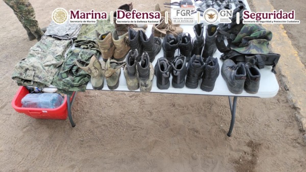 Posteriormente, se ubicó y desmanteló un campamento clandestino donde se encontraron vehículos, así como armamento, municiones, ropa, calzado táctico y material diverso.