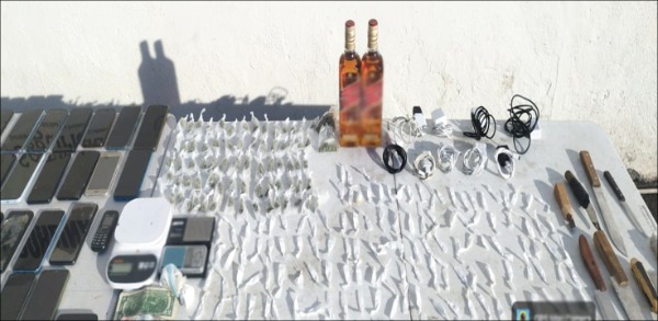 -En Culiacán, en el Centro Penitenciario Aguaruto, elementos de GN, Ejército Mexicano y Policía Estatal aseguraron dos armas largas, nueve armas cortas, 34 cargadores, 316 cartuchos, una granada, dosis de cocaína y marihuana, 59 teléfonos celulares, 16 cargadores para celular, un modem, una banda ancha, 12 equipos de radio comunicación, cuatro cargadores para radio comunicación, tres basculas grameras, 19 objetos punzocortantes, dos botellas de alcohol, dos candados de manos, 116,823 pesos y 16 dólares americanos.