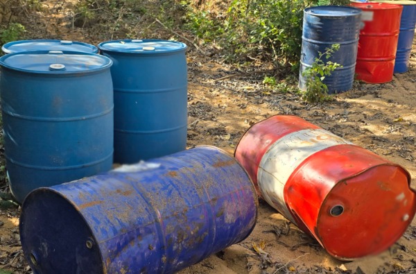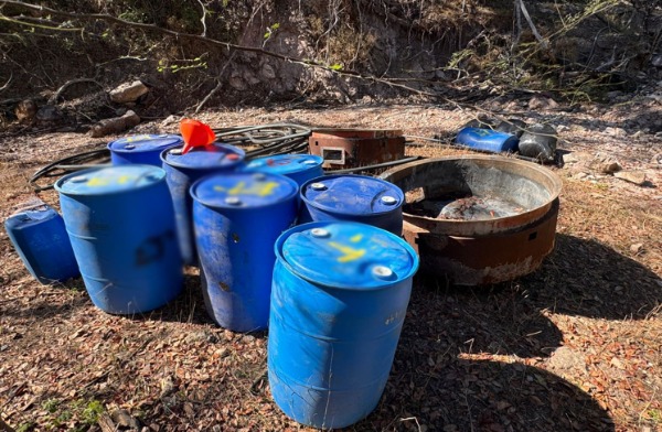 En Petatlán, Guerrero, elementos de GN y Ejército Mexicano localizaron y aseguraron un área de concentración de material diverso, 550 litros de sustancias químicas para la elaboración de metanfetamina, tres condensadores y tres tanques de gas L.P.