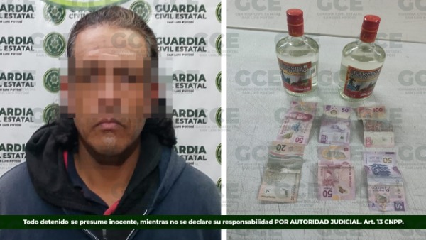 Los hechos tuvieron lugar en la colonia Plan Ponciano Arriaga, sitio a donde arribaron los elementos estatales y detuvieron a Juan "N" de 36 años, quien presuntamente trató de huir con dos botellas de licor y 320 pesos en efectivo.