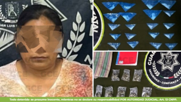 Los hechos se suscitaron en el ejido General León Martínez, donde fue detenida Victorina "N" de 39 años, a quien se le aseguraron ocho bolsas con marihuana y 35 dosis de "cristal", quedando a disposición de la Fiscalía General del Estado.