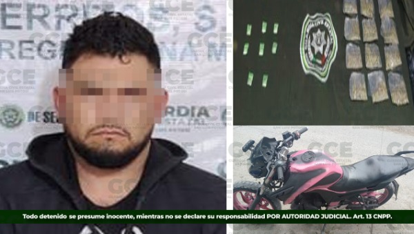 De manera adicional, durante la intervención se le localizaron diversas dosis de presunta droga, consistentes en: ocho dosis de "cristal", 12 dosis de marihuana y una motocicleta.
