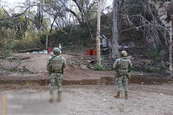 Elementos de la Secretaría de Marina resguardan un presunto laboratorio clandestino en una zona rural, como parte de los operativos contra la producción de drogas sintéticas en el país