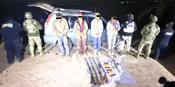 • En Hidalgo, elementos de la GN, Ejército Mexicano, Policía Estatal y Municipal detuvieron a cuatro personas, les aseguraron cuatro armas largas, 64 cartuchos y un vehículo