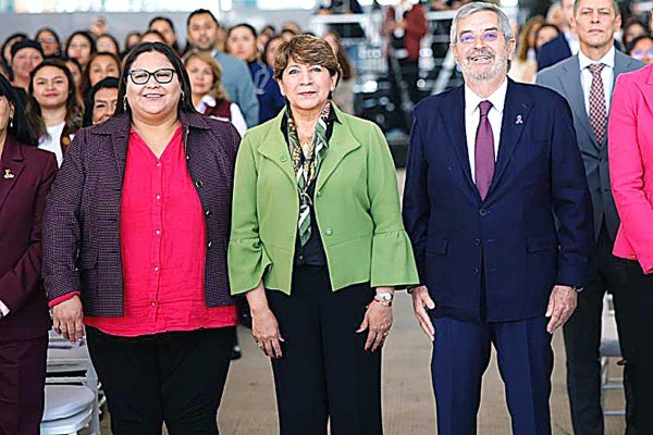 Citlalli Hernández, secretaria de las Mujeres, Delfina Gómez, gobernadora del Edomex y Juan Ramón de la Fuente, titular de la SRE.