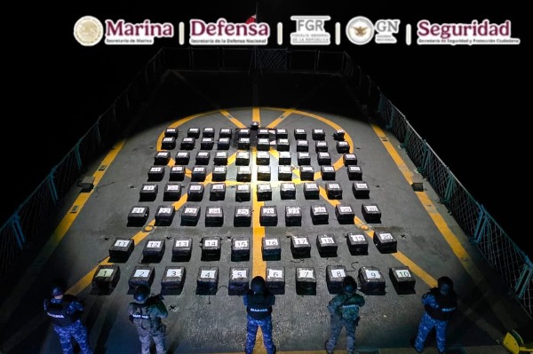 En una operación marítima encabezada por elementos de la Secretaría de Marina (Semar), a través de la Armada de México en funciones de Guardia Costera, en coordinación con la Fiscalía General de la República (FGR) y la Secretaría de Seguridad y Protección Ciudadana (SSPC), se aseguraron 80 bultos con aproximadamente dos toneladas de presunta cocaína, cuyo peso exacto será determinado por las autoridades ministeriales correspondientes.