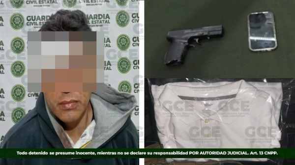 En la capital potosina, en la colonia Simón Díaz, la GCE detuvo a un adolescente de 17 años y a Ricardo "N", de 37 años, luego de presuntamente atracar un negocio en la zona, dónde la parte afectada refirió que fue amagada para despojarla de su celular y de mercancía de su establecimiento. Al momento de su detención se les aseguró una réplica de arma de fuego y los objetos robados.