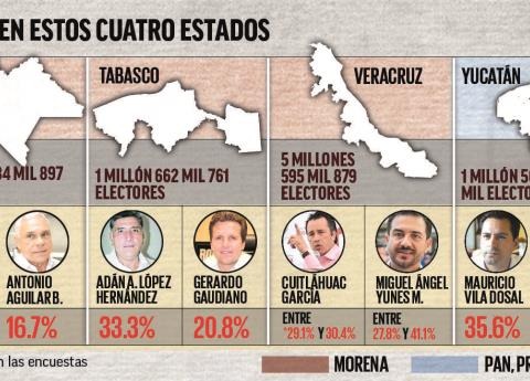 En Chiapas, Veracruz y Tabasco se elegirá gobernador y los candidatos punteros en las encuestas son los de la coalición que encabeza Morena