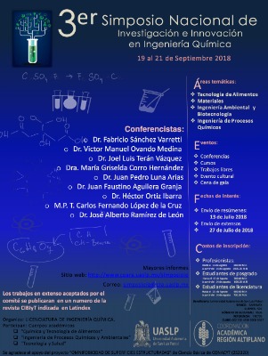 La Universidad Autónoma de San Luis Potosí (UASLP), invita a los estudiantes de ingeniería y de sus posgrados a formar parte del 3er Simposio Nacional de Investigación e innovación en Ingeniería Química, el cual se llevará a cabo del 19 al 21 de septiembre del 2018, en las instalaciones de dicha entidad.