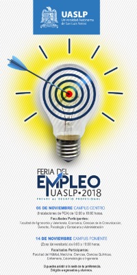 La próxima "Feria de Empleo UASLP 2018" se llevará a cabo en el Campus Poniente., el 14 de noviembre, en la Zona Universitaria, de 09:00 a 16:00 horas