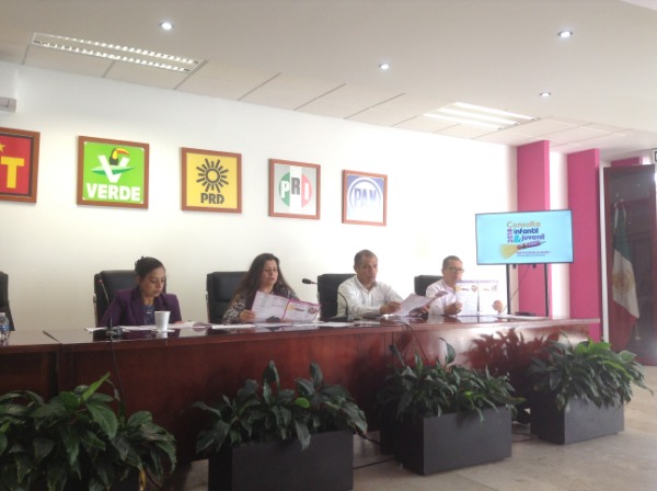 De manera conjunta la Delegada del Instituto Nacional Electoral Ana Lilia Pérez Mendoza, la Presidenta del Consejo Estatal Electoral y de Participación Ciudadana Laura Elena Fonseca Leal, el Delegado del Consejo Nacional para el Fomento Educativo Julio César Vázquez, Tonatzin Lara en representación de la SEGE y Victor Hugo Galván en representación de la Universidad Intercultural dieron los pormenores del ejercicio infantil y juvenil que se desarrollará en las próximas semanas a fin de contar con un diagnóstico para conocer las necesidades e inquietudes de los menores y contar con la posibilidad de generar políticas públicas.