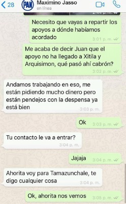 A lo que el líder panista ligado al Diputado Local Rubén Guajardo, justifica diciendo que anda trabajando en eso, "pero me están pidiendo mucho dinero, pero están bien pendejos, con la despensa ya está bien" advierte y más adelante le informa que va para Tamazunchale, presuntamente a comprar votos también.