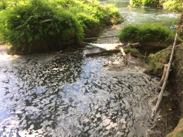 El día de hoy habitantes del paraje El jabalí perteneciente al municipio de Aquismón, San Luis Potosí, denunciaron ante este medio la presencia de espuma y animales muertos en el afluente del Río Gallinas, desde hace días tenían conocimiento de una extraña pigmentación de color rojo y una espuma muy peculiar, comentan que la factoría de nueva cuenta derramó contaminantes que afectan al paraje El Jabalí.